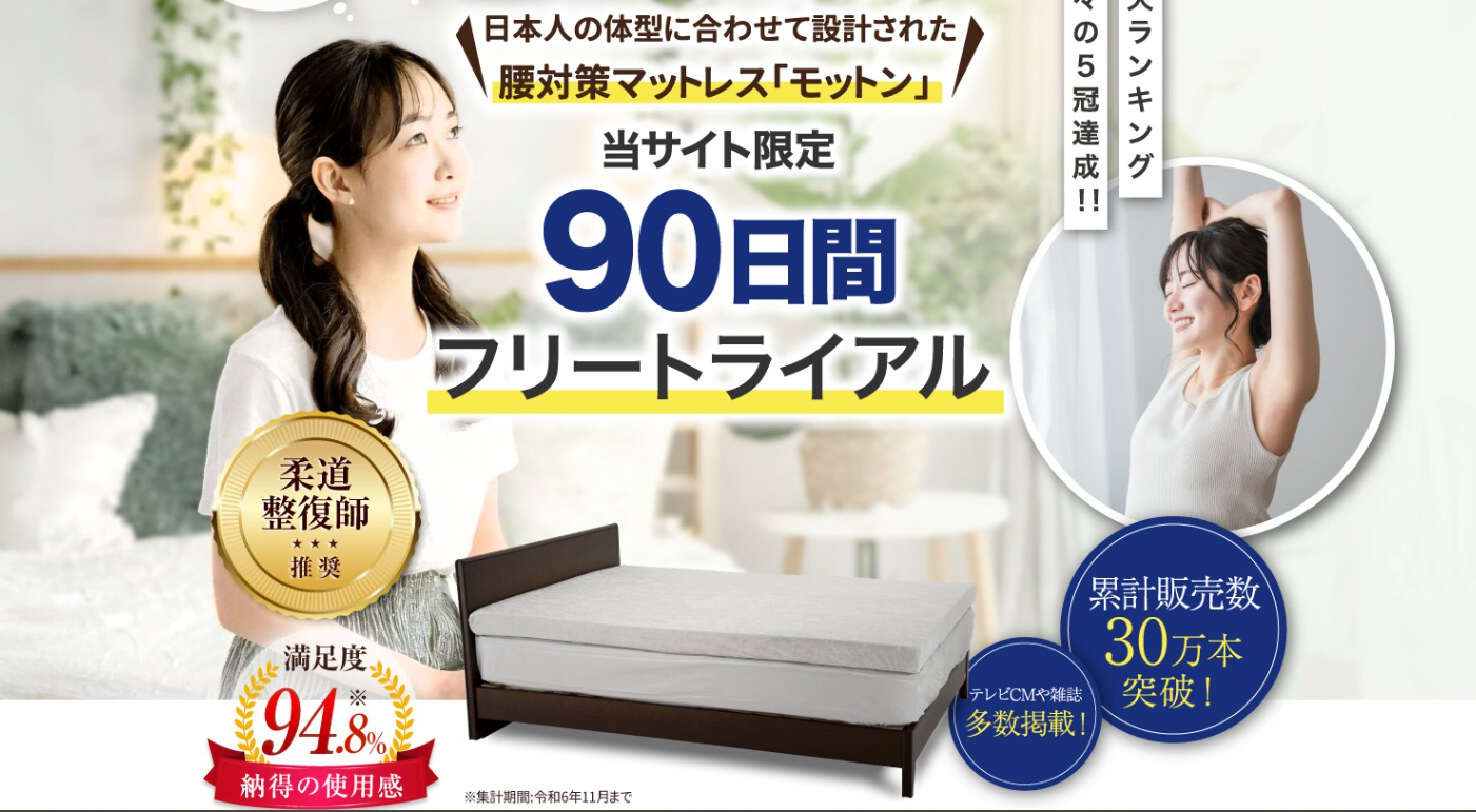 「寝ても腰が痛い」「寝返りがうまく打てない」「朝起きると体がだるい」──そんな睡眠の不満を抱えている方におすすめしたいのが Motton(モットン)マットレス。