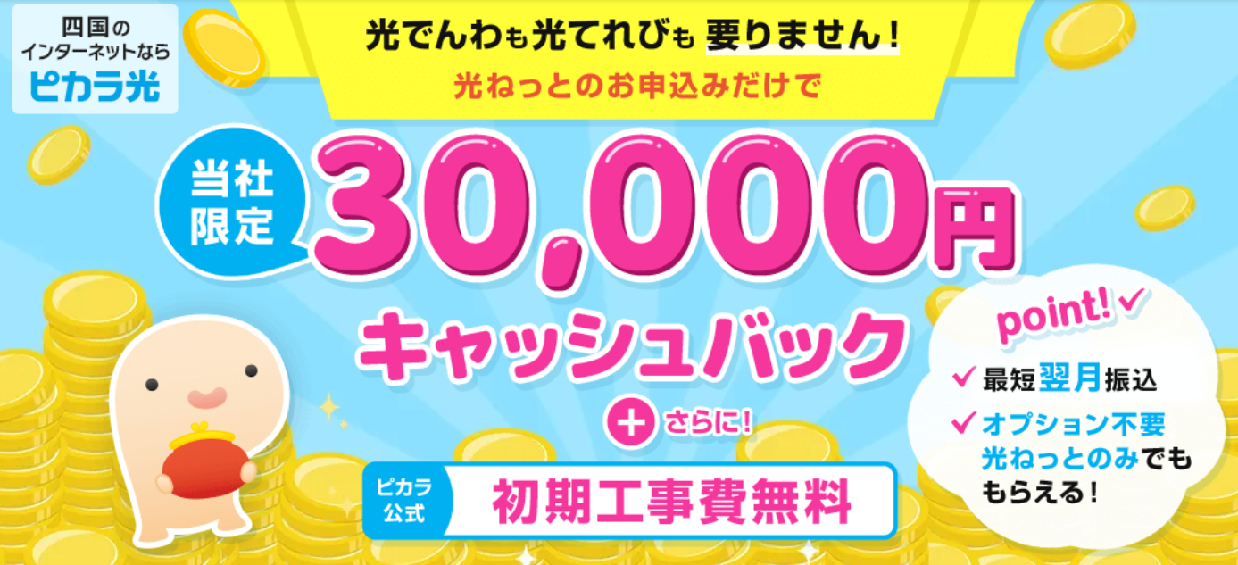 「四国で安定した光回線を使いたい」「キャッシュバックや割引が欲しい」「契約後に面倒なことは避けたい」――そんな希望を叶える光回線として注目されているのが ピカラ光。